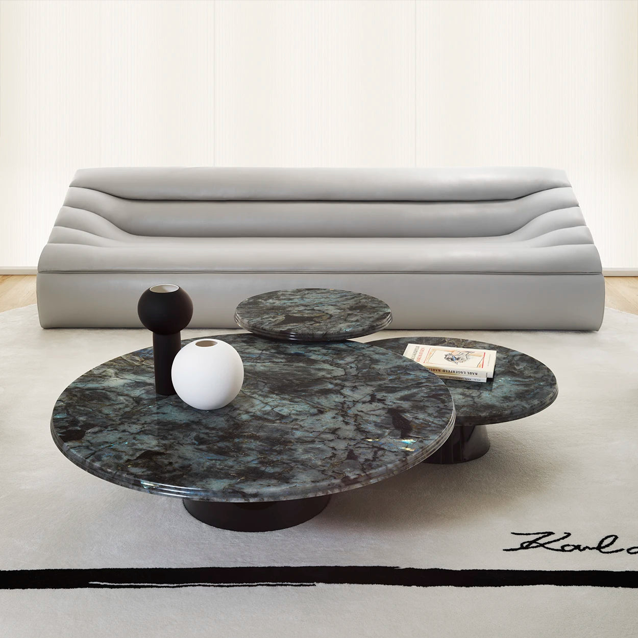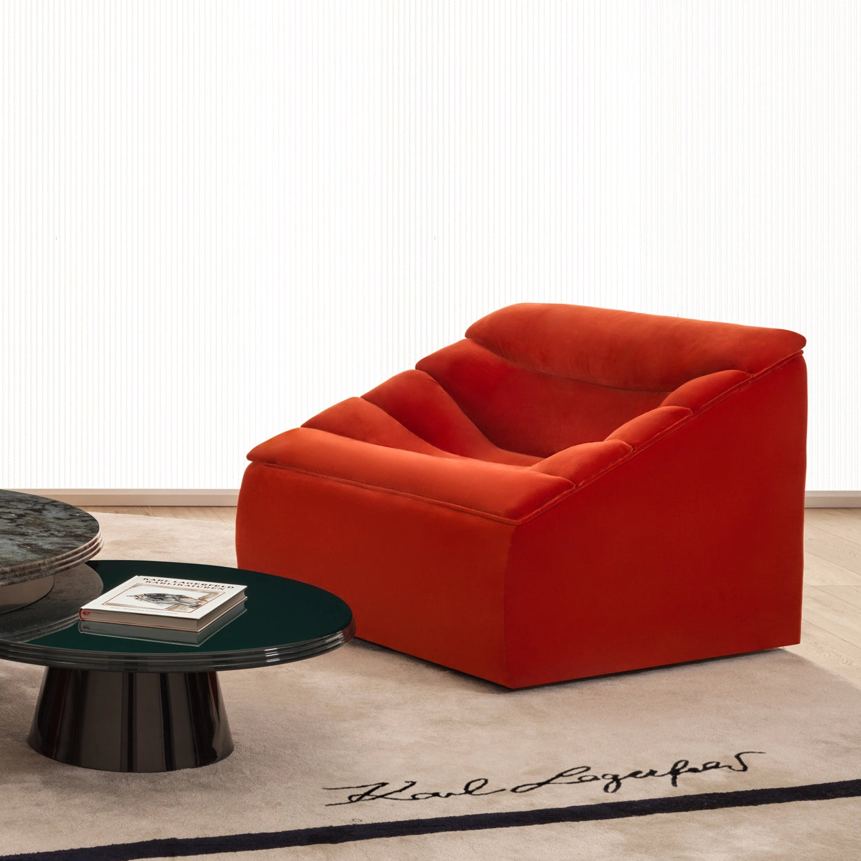 The collection pays homage to Karl Lagerfeld’s aesthetic legacy, focusing on his passion for architecture and his interior design sensibility and embodying it in a contemporary guise. The bold selection of finishes and colours – such as silver leather, bold coloured velvets, and opalescent lemurian blue labradorite – enhances and conveys the softness of the lines.