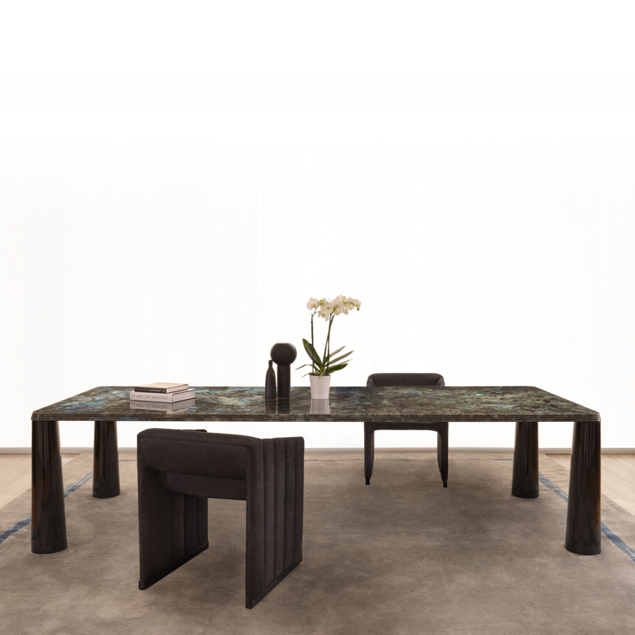The exceptional Italian craftsmanship is elevated through the use of velvet, metallic leather and opalescent marble. The Labradorite Lemurian Blue marble finishing lights up the surfaces and enriches the whole collection.